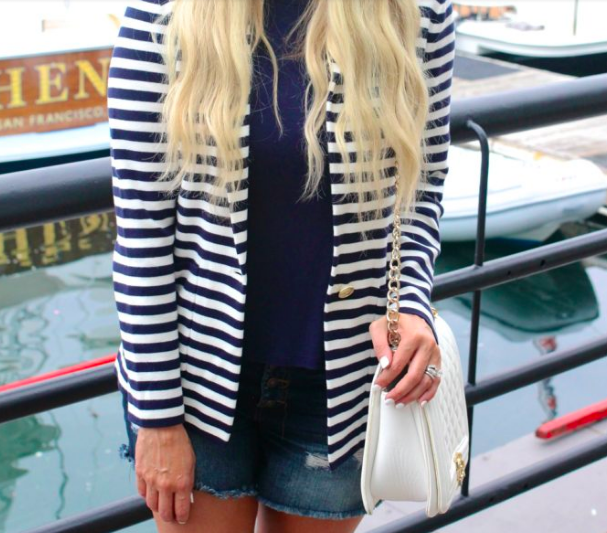 Amo credere che vestendomi come penso di essere riuscirò a convincere anche gli altri di come devono vedermi. Per questo oggi ho indossato questa maglietta rossa a righe bianche abbinata a degli shorts di jeans e a un maglioncino blu con le stelline – solo per fare scena, con questo caldo chi avrebbe il coraggio di metterselo! – per darmi un tono giovanile “made in USA”.